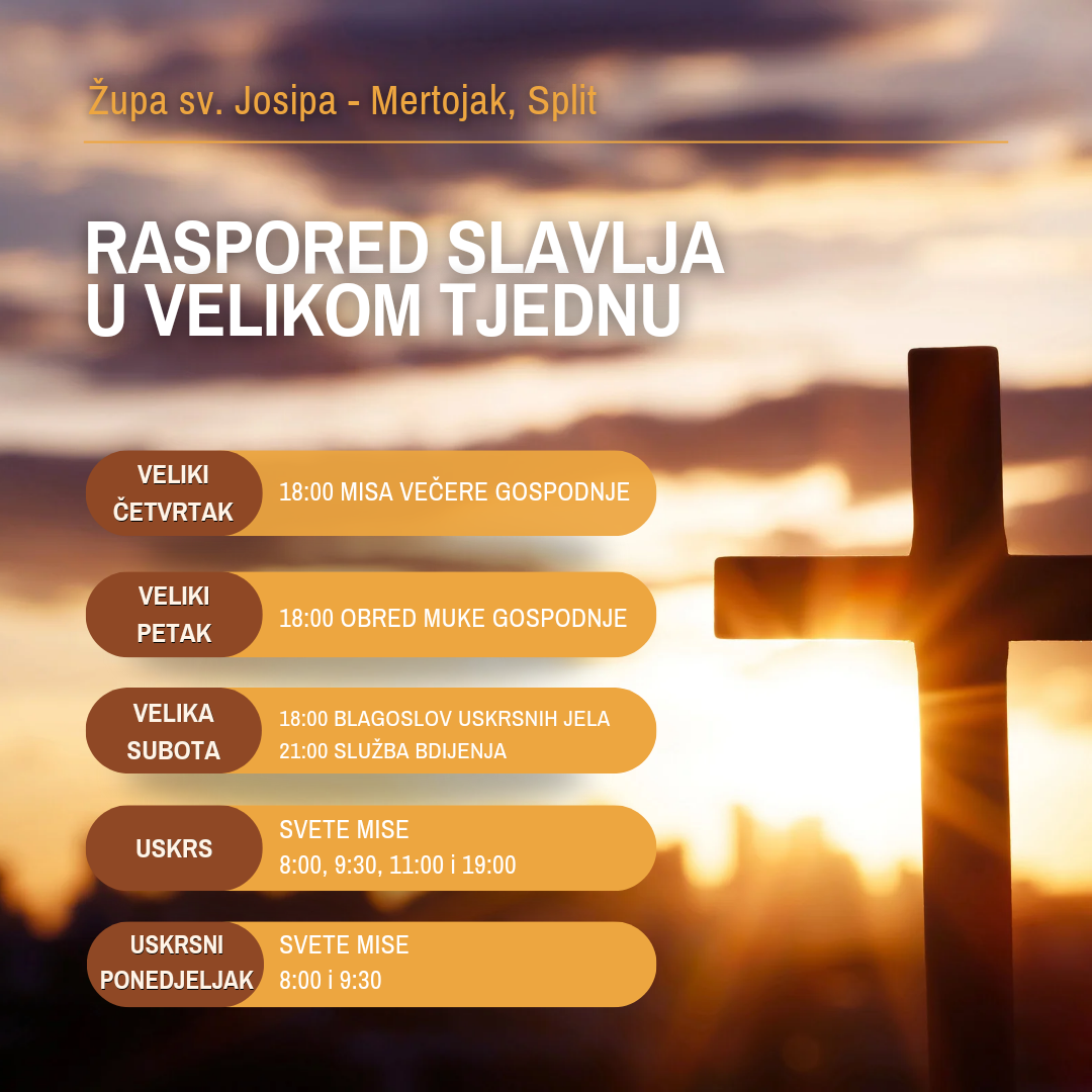 Raspored slavlja u Velikom tjednu u našoj župi možete vidjeti na fotografiji. Priliku za svetu ispovijed imate svakim...