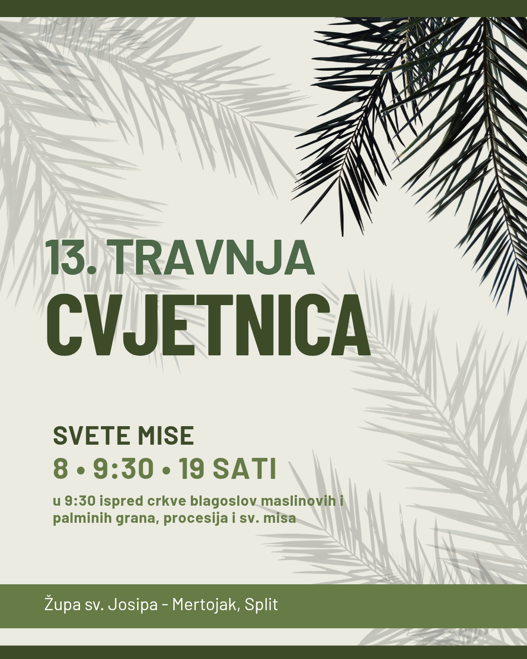 U našoj župi na Cvjetnicu svete mise bit će u 8, 9:30 i 19 sati. Mise u 11 sati neće biti. Svetoj misi u 9:30 pretho...